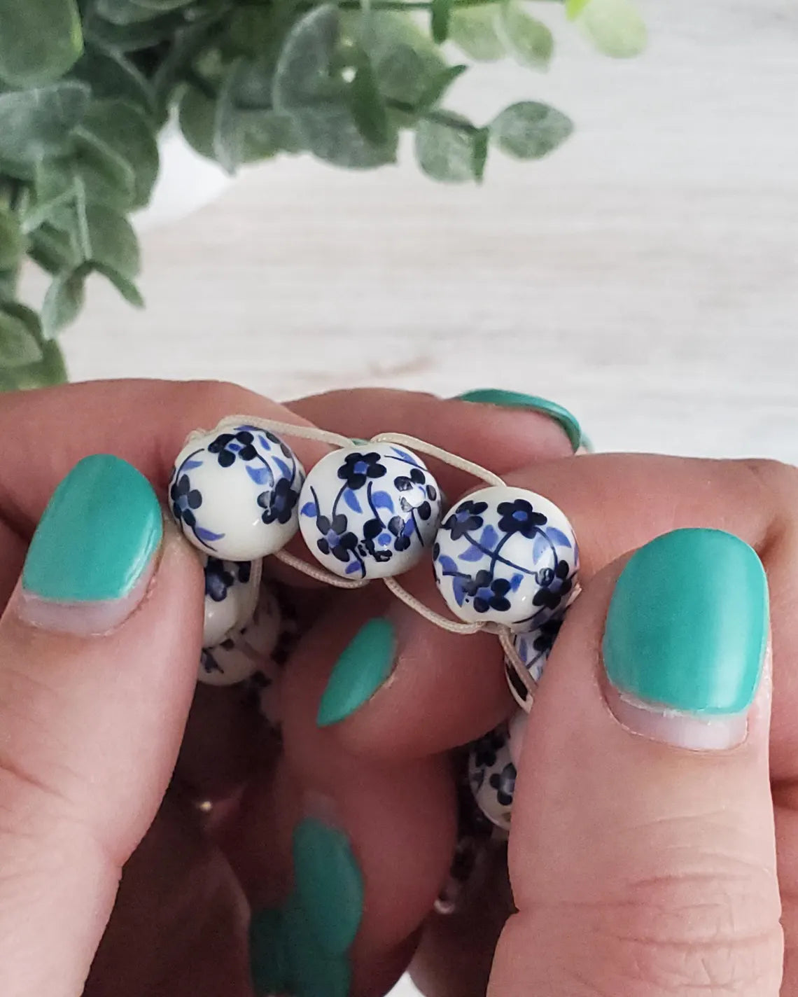 --9 White Ceramic beads (approximately 12 mm) with Blue China pattern flowers