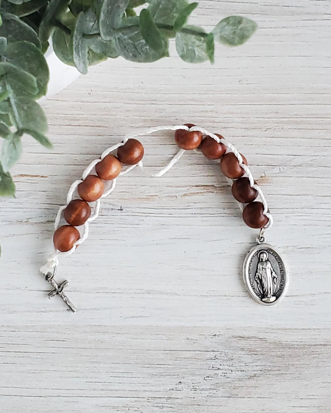 Set of sacrifice beads, modeled after those used by St. Therese of Lisieux to count little acts of kindness or little sacrifices made for love of others throughout the day. Keep the beads in your pocket and each time you offer something up (holding your tongue, stubbing your toe, emptying the dishwasher, anything you can think of!), move a bead towards the Crucifix. This beautiful practice will help foster your ability to see opportunities to offer every moment to God.